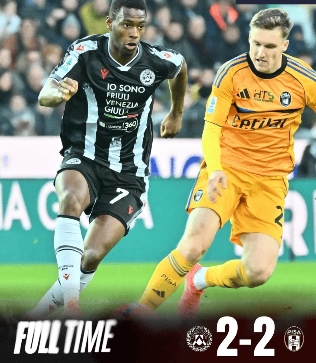 乌迪内斯上轮意甲主场2-2战平垫底的比萨,未能延续击败都灵的良好势头,在这一轮的一周双赛中他们一胜一平一负,表现中规中矩。相比击败都灵的首发阵容,贝尔托拉取代克里斯滕森担任右后卫。比萨中场特拉莫尼在比赛中闪耀全场,上半场他的世界波攻破Maduka Okoye的十指关。乌迪内斯中卫Christian Kabasele接到扎尼奥洛开出的角球扳平比分,埃克伦坎普赢得点球,戴维斯操刀主罚反超比分。下半场还是特拉帕尼的传中找到皮奇尼尼,Maduka Okoye扑出了后者的射门但未能挡住梅斯特的射门。梅斯特和乌迪内斯的阿塔随后射中对方门柱,乌迪内斯最终主场和升班马握手言和。乌迪内斯目前排名第十,领先降级区十二分,落后第六的科莫八分。